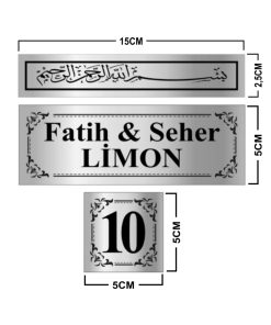 DİKKAT: İSİM ve NUMARA vb.; ; BİLGİLERİ BİZE SİPARİŞ NUMARANIZLA BİRLİKTE SORU SOR KISMINDAN İLETEBİLİRSİNİZ Paket İçeriği -1 Adet Kapı İsimliği 15X5cm -1 Adet Kapı Numarası 5x5cm -1 Adet Besmele 15X2,5cm Ürün Bilgisi Ürün 0,5mm aynalı Metal üzerine Süblimasyon yani Isı ile Baskılı olarak üretilir.; ; Ürünün arkasında kaliteli çift taraflı bant mevcuttur rahatlıkla yapıştırabilirsiniz.;