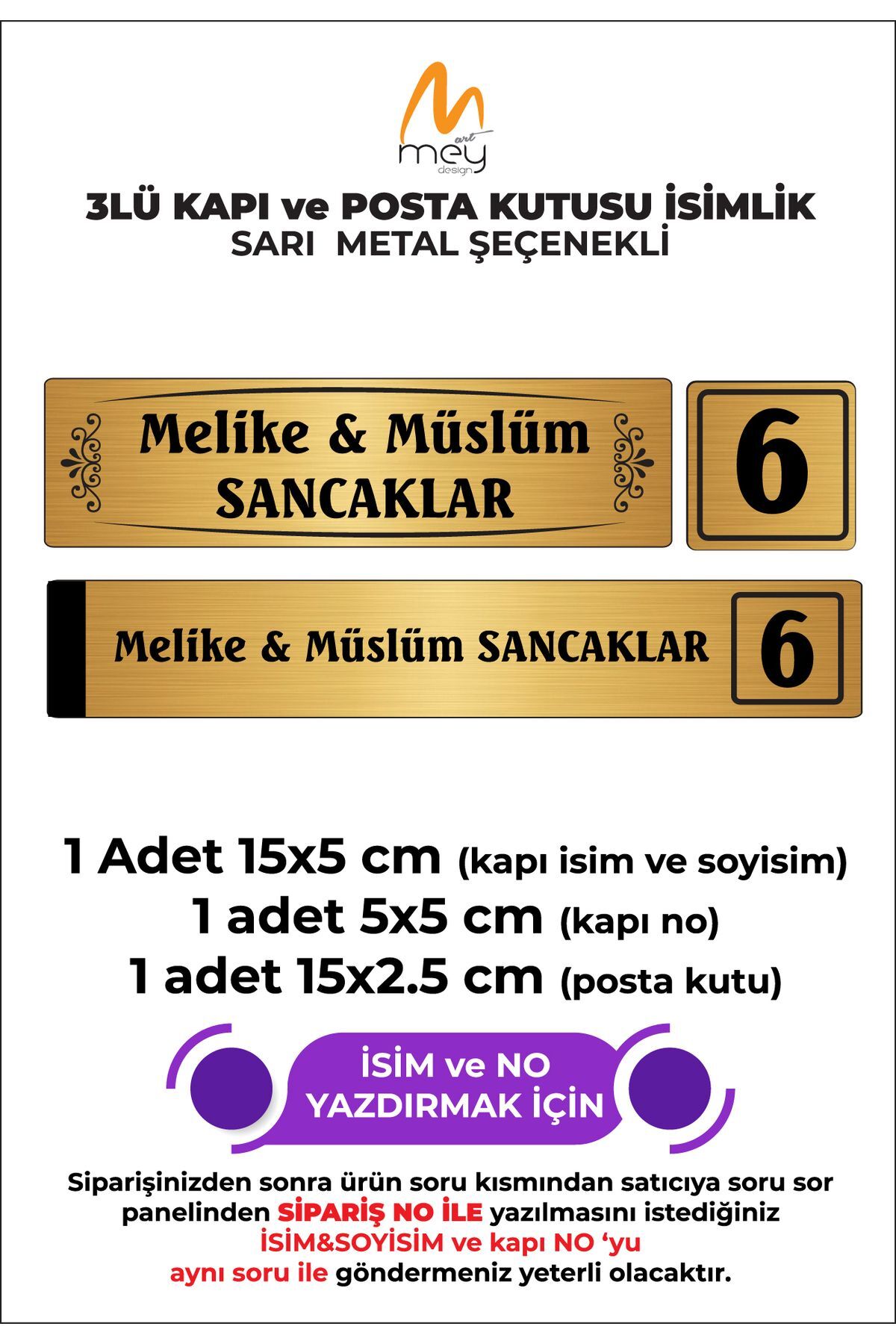 Ürün İçeriği : ALTIN RENK 15x5cm Kapı İsimliği – 5X5cm Kapı Numarası -15×2,5cm Posta Kutusu İçin İsimlik ARKASINDA çift taraflı bant bulunmaktadır. ; uygulaması çok kolaydır. ; Metal üstüne süblimasyon baskı tekniği ile baskı yapılmaktadır. ; ürünün baskısı gayet dayanıklıdır ve nettir. ; İSİM SOYAD ve numara bilgilerini siparişinizden sonra BİZE SİPARİŞ NUMARANIZLA BİRLİKTE SORU SOR KISMINDAN İLETEBİLİRSİNİZ. ; Ürünlerinizde kalite problemi yaşamamak adına MeyArt Ajans mağazamızdan alışveriş yapmanızı dileriz.;