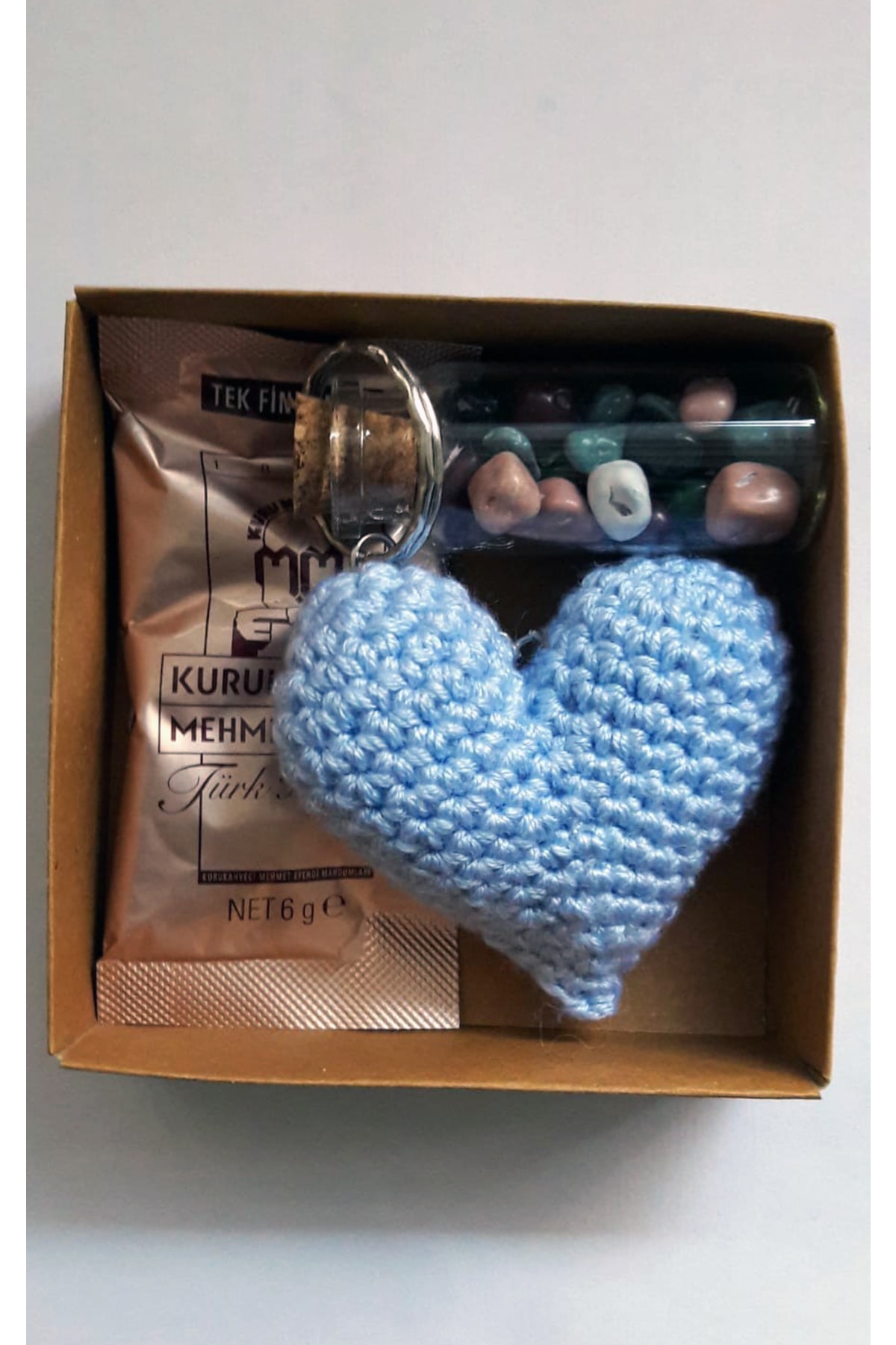 Hediyelik Doğum Günü ve Özel günlerinizde Dağıtmalı Amigurumi Kalp Anahtarlık Kahve ve Çakıl Taşı Çikolata; Paket İçeriğimiz: ; Özel El işlemesi Amigurumi Kalp Anahtarlık ; Taze Çakıl Taşı Çikolata ; 6 gr Türk Kahvesi ; Süslenmiş Karton Kutuda ; Not: Yüz de yüz el emeği ile yapılan Amigurumi Kalp Kadın Girişimcileri Destekleme Amaçlı üretilmiştir. ; Kutu Boyutu 9*9*3 ;
