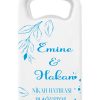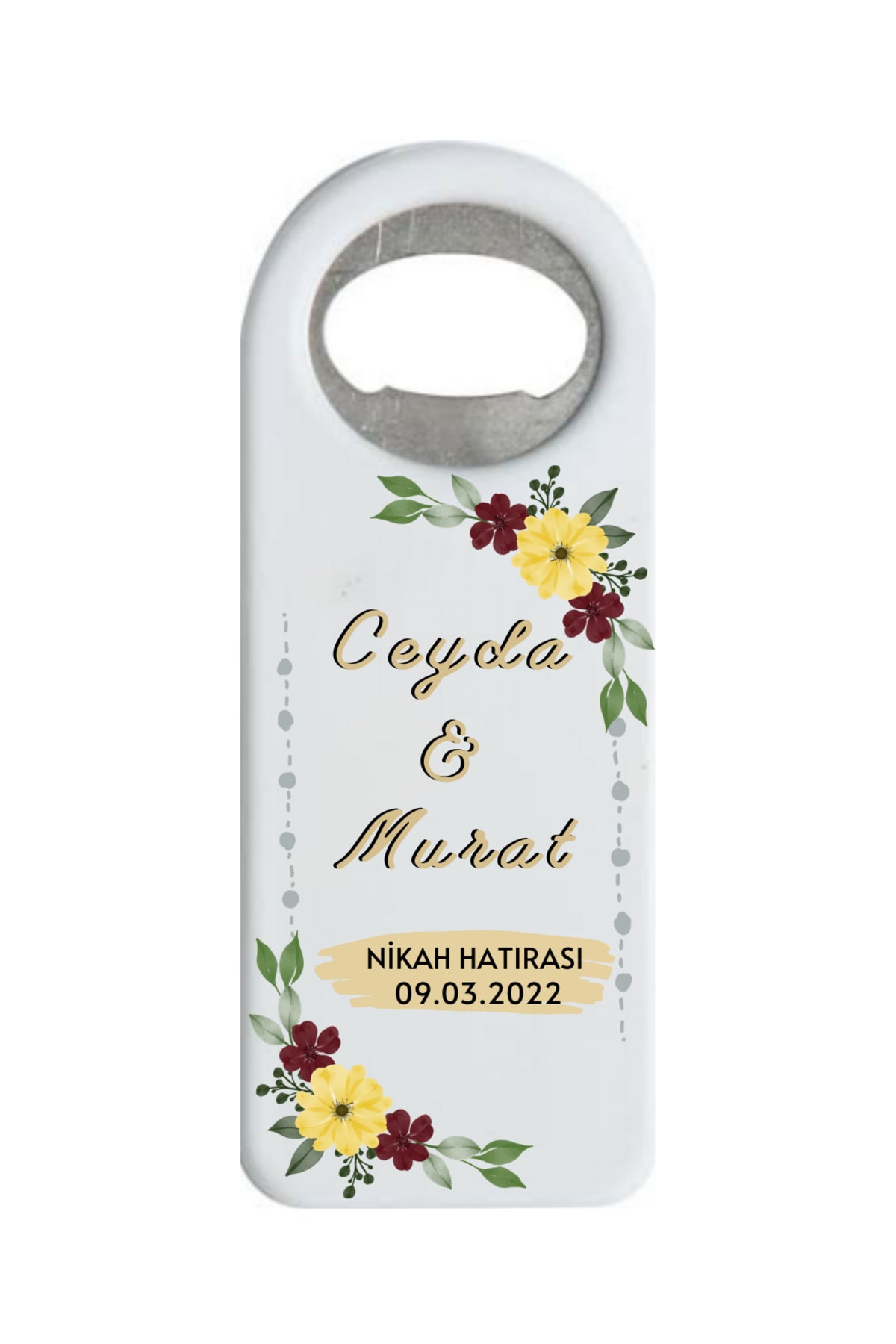 Ürünümüz 40×105 mm boyutlarında sert plastik malzemeden üretilmiş olup açacak kısmı metaldir. Hem şişe açacağı hem de buzdolabı süsü olarak kullanılabilir. Söz,nişan,nikah,düğün,babyshower,dogum günü,mevlüd,yeni doğan etkinliği gibi günlerde kalıcı ve kullanışlı olacaktır ;