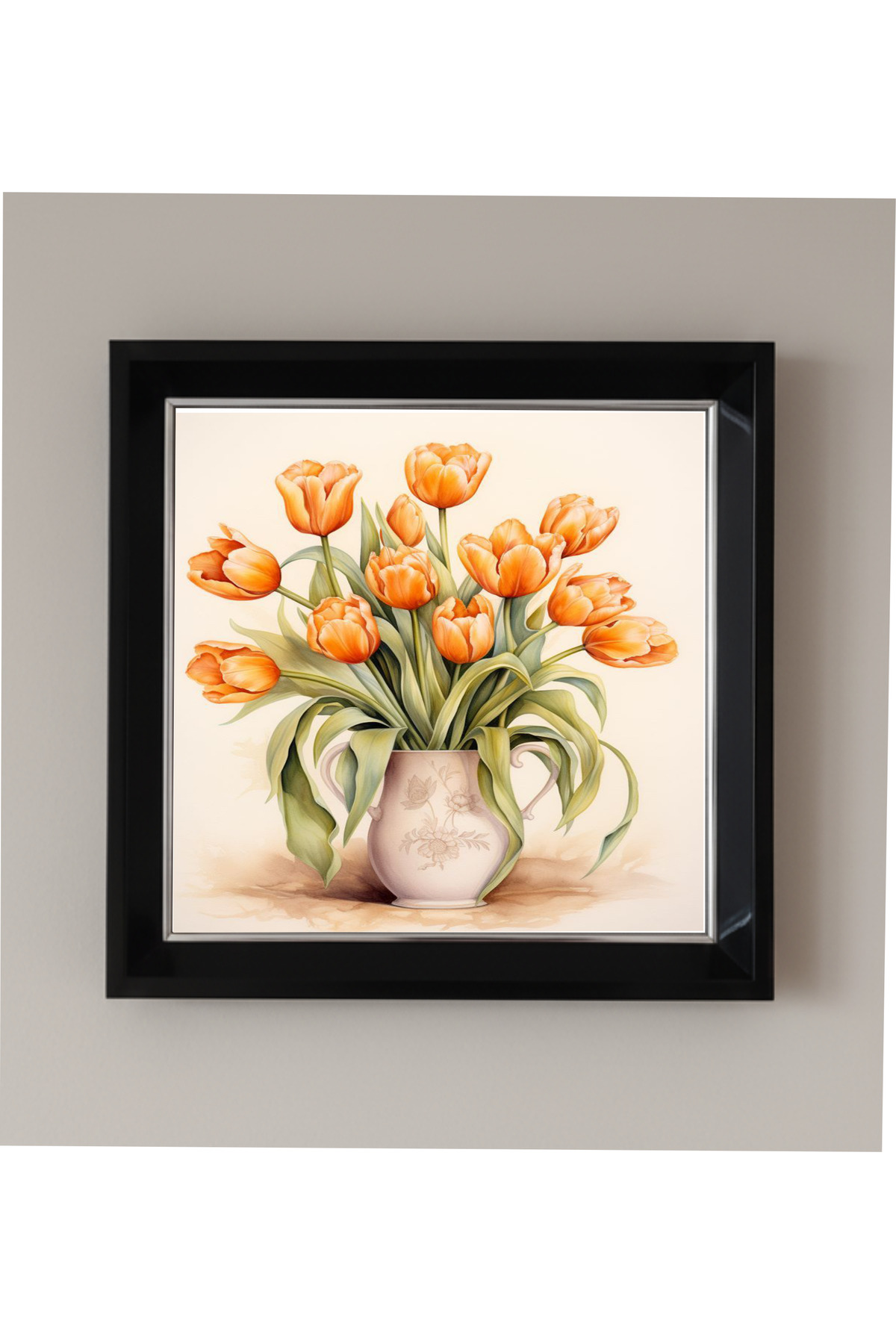 Çerçeveli Pleksi Camlı Vazo ve Turuncu Laleler Temalı Tablo 20 x 20 cm