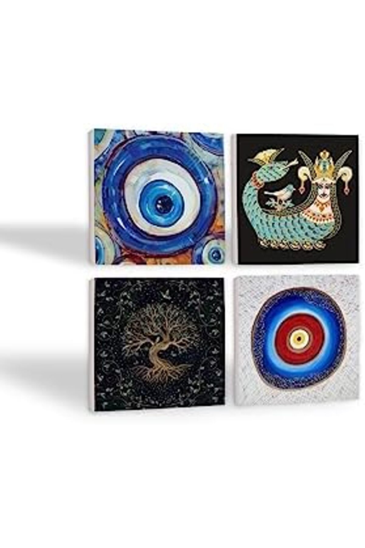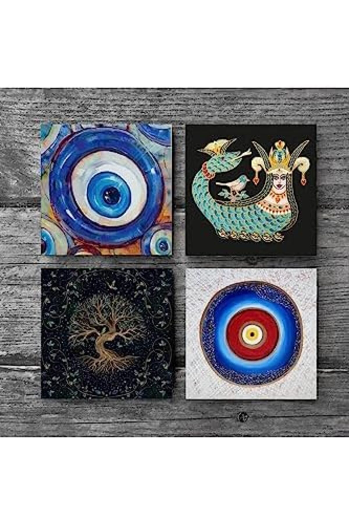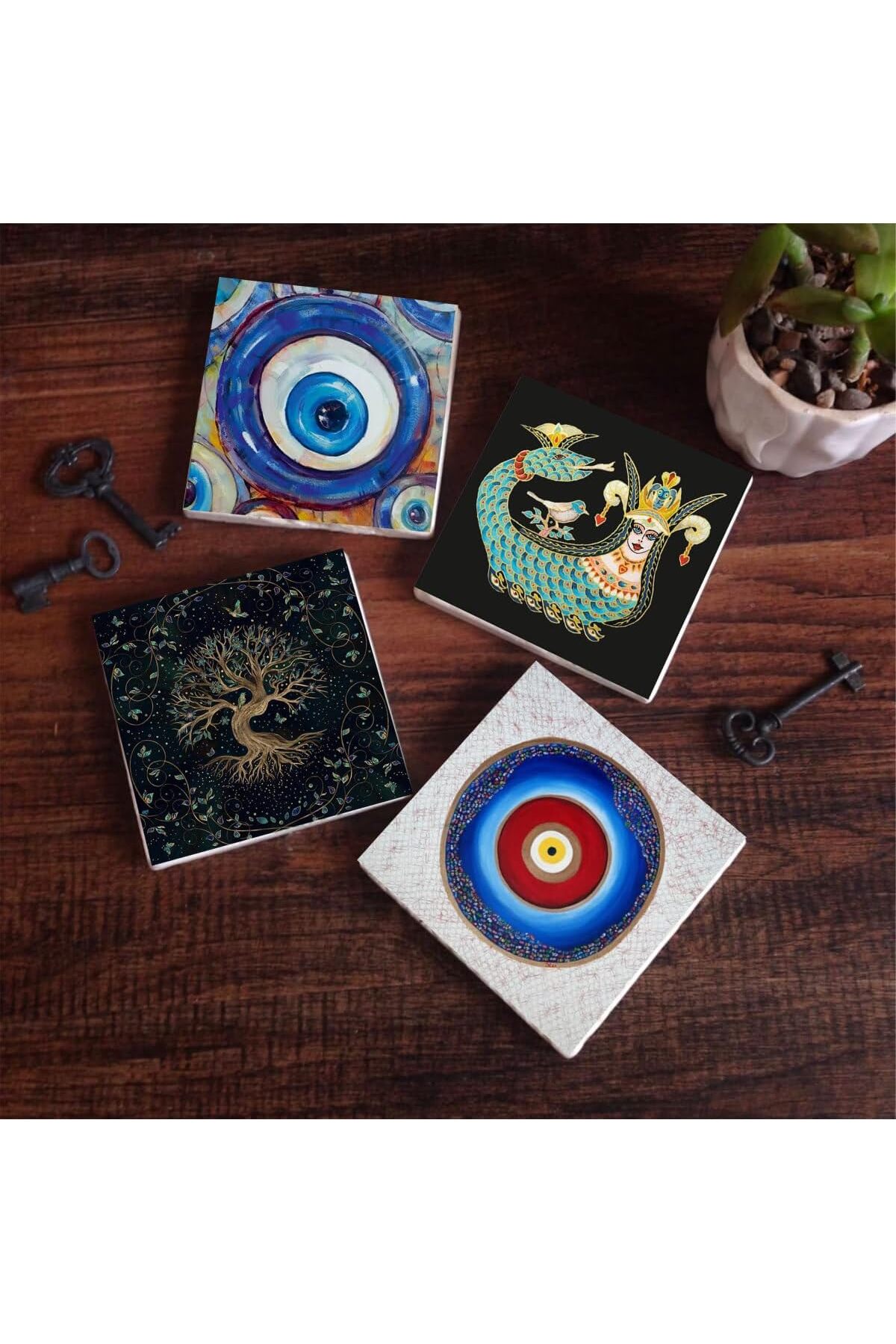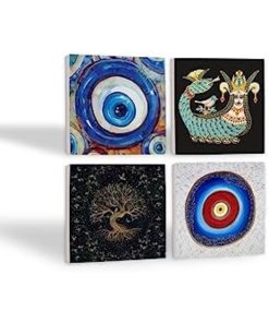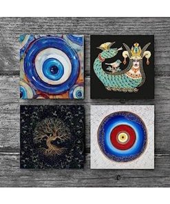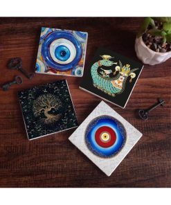 Nazar, Hayat Ağacı, Şahmeran Taş Bardak Altlığı Seti – 4 Parça – Dekoratif, Rustik Mutfak A